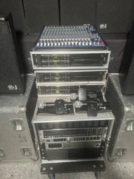 Pack de sonido completo con altavoces RAM Audio PM-10, mesa de mezclas de 20 canales y 6 sistemas inalámbricos Shure UC (manos, petacas y lavalier). Con flightcase incluido